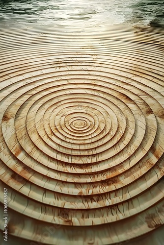 Fototapeta premium A serene close-up of concentric ripples in wooden surface, creating a calming effect with soft lighting reflecting off the water in the background, suggesting tranquility and harmony.
