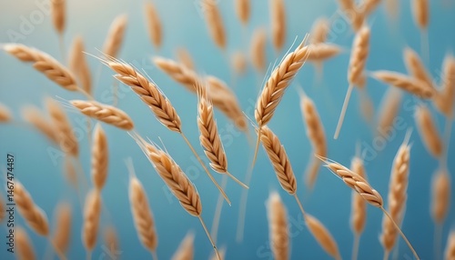 Fototapeta premium A serene close-up of golden wheat stalks swaying gently against a bright blue...