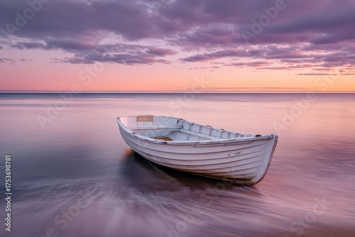 © whitestorm, Fototapeta premium A serene coastal scene featuring a weathered rowboat beached at sunset, with the tranquil water reflecting the pastel sky and soft hues of the twilight, creating a peaceful ambiance.