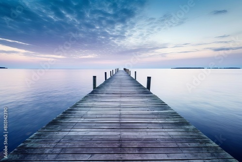 © Pakorn, Obraz premium A serene coastal scene with a single wooden pier extending into a calm ocean at dawn, space for text