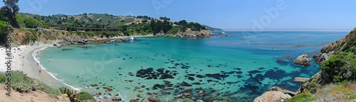 Fototapeta premium A serene coastal view featuring clear turquoise waters, rocky shores, and...