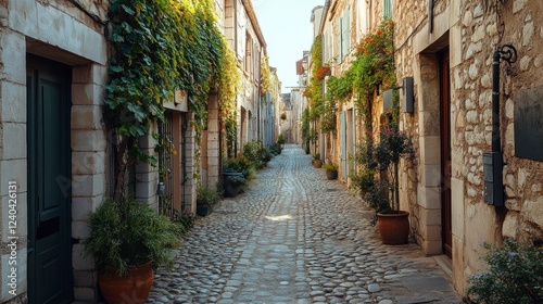 © ZpongXED, Fototapeta premium A serene cobblestone street flanked by charming stone buildings adorned with greenery and potted plants, inviting exploration and tranquility.