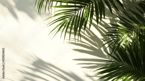 © Naphol, Naklejka premium A serene composition of palm leaves casting delicate shadows against a light wall, evoking a tropical ambiance.