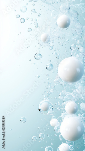 Obraz premium A serene composition of translucent bubbles and smooth white spheres floating in a soft blue background, evoking purity, freshness, and lightness.