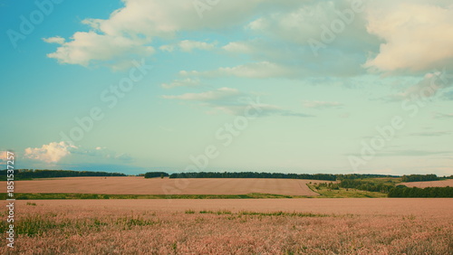 Fototapeta premium A Serene Countryside Landscape Filled with Blossoming Fields and Clear Blue...