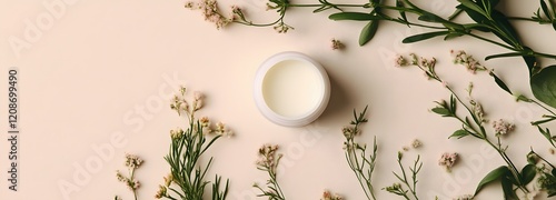 © Mr image, Fototapeta premium A serene cream-colored background with a few pastel-colored flowers, providing space for product placement.