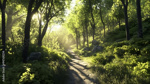 © Mr image, Naklejka premium 63. "A serene 3D render of a lush green forest with a winding trail and dappled sunlight filtering through the trees