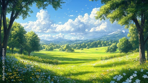 Obraz premium A serene daytime view of a lush green meadow surrounded by trees and distant...