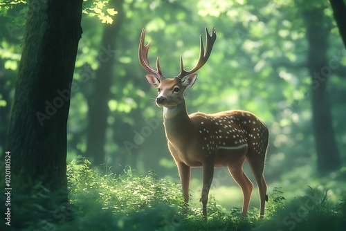 Fototapeta premium A serene deer stands in a sunlit forest, surrounded by lush greenery and soft...
