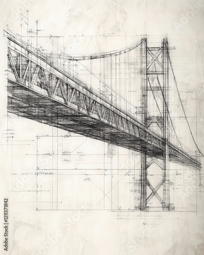 Fototapeta premium A serene depiction of a bridge design blueprint, with elevation and...