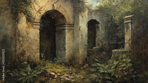 Fototapeta premium A serene depiction of ancient ruins overgrown with lush vegetation.