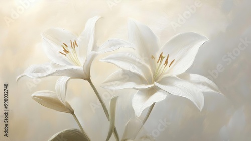 © JSR Art Studio, Obraz premium A serene depiction of two white lilies against a soft background, evoking tranquility.