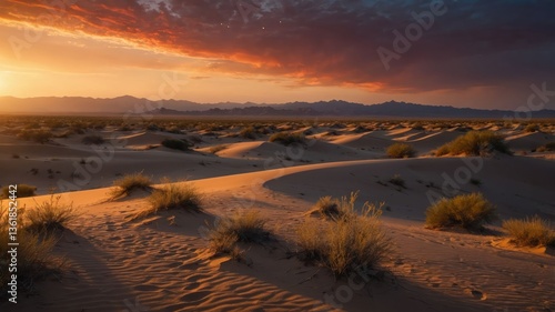 Fototapeta premium A serene desert landscape at sunset, showcasing sand dunes and vibrant sky...