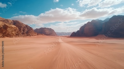 © tinnakorn, Naklejka premium A serene desert landscape featuring sandy terrain, rocky cliffs, and a clear blue sky with fluffy clouds.