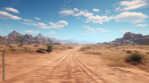 Naklejka premium A serene desert landscape with a dirt road, rocky formations, and a clear...