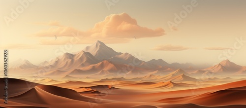 Naklejka premium A serene desert landscape with mountains and soft clouds at sunset.