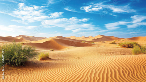 Fototapeta premium A serene desert landscape with sand dunes under a strikingly clear blue sky,...