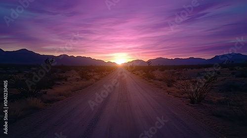 © Dumrongkait, Fototapeta premium A serene desert road leads into a stunning sunset, with vibrant hues of purple and gold illuminating the sky over mountains.
