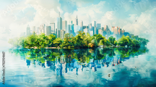 Obraz premium A serene digital artwork of a city skyline with lush greenery reflected on a...