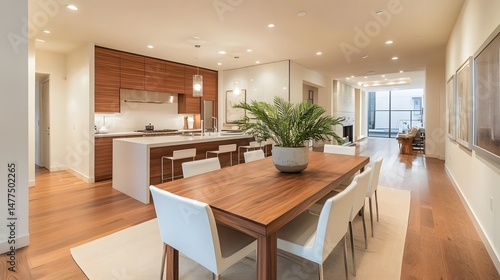 Fototapeta premium 62. A serene dining area featuring a wooden table, sleek white chairs, and a...