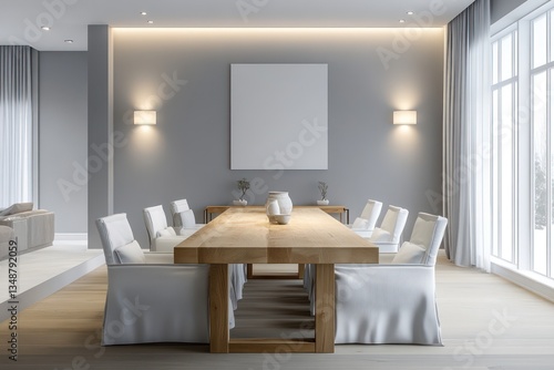 Fototapeta premium A serene dining room with light gray walls, a long wood table, and white...