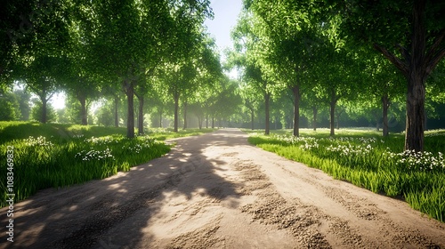 © JSR Art Studio, Obraz premium A serene dirt path through a lush green forest, illuminated by soft sunlight.