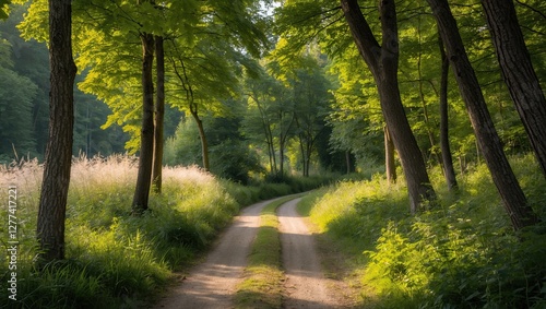 © PURE SP, Obraz premium A serene dirt path winding through a lush green forest with sunlight filtering through the trees, creating a peaceful atmosphere