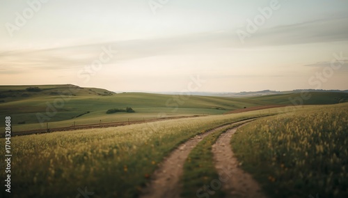 © Okay, Obraz premium A serene dirt path winding through rolling green hills at sunset in the rustic countryside