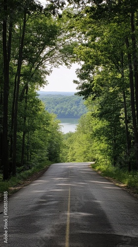 Naklejka premium A serene drive through lush green trees overlooking a tranquil lake on a...