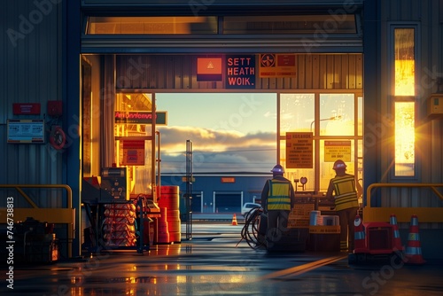 © Nazia, Naklejka premium A serene, early morning scene at a factory, with the focus on safety signs and equipment prominently displayed at the entrance.