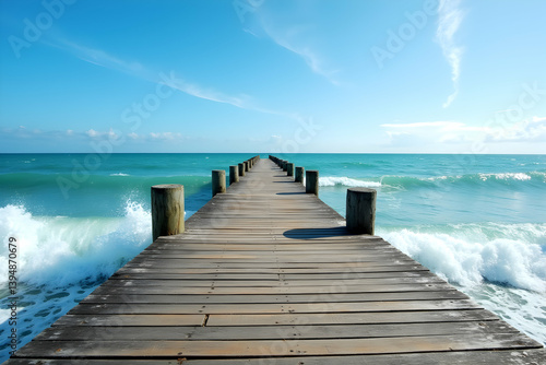 Obraz premium A Serene Escape, Capturing the Tranquility of a Weathered Wooden Pier Extending into the Turquoise Expanse of the Ocean Under a Clear Blue Sky