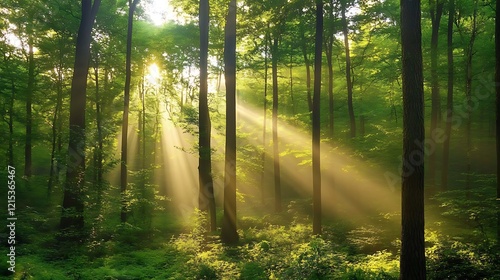 © Creative Insights, Obraz premium "A Serene Escape into the Heart of a Lush Green Forest, Vibrant with Life, Towering Trees, and Nature's Tranquil Beauty"