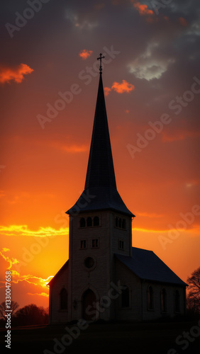 Fototapeta premium A serene evening scene with a Christian church's silhouette against an orange...