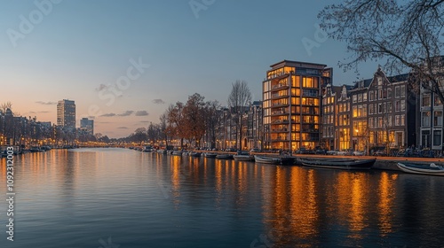 Fototapeta premium A serene evening view of Amsterdam's canals, showcasing illuminated buildings...