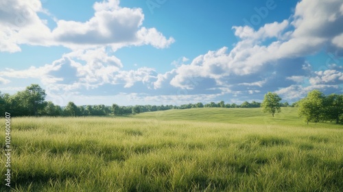Fototapeta premium A serene, expansive meadow with tall grass and scattered trees under a blue...