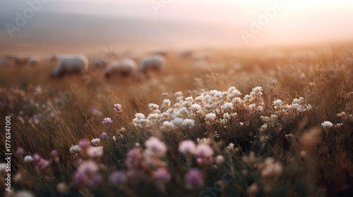 © Thares2020, Obraz premium A serene field of wildflowers bathed in golden morning light with sheep grazing in the distance
