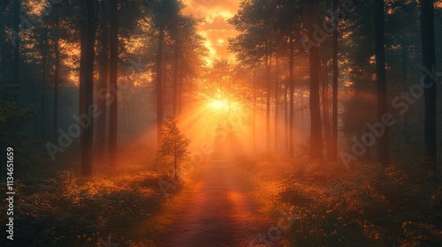 Obraz premium A serene forest at sunset, with rays of light filtering through the trees and illuminating the path.