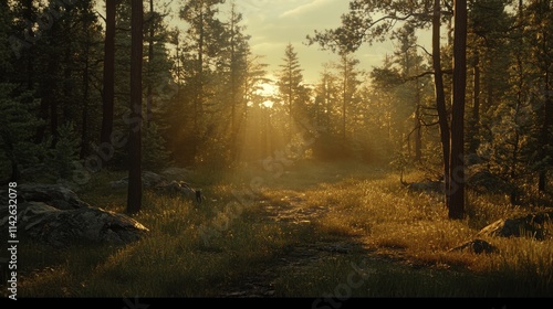 © Charoen, Obraz premium A serene forest clearing with golden sunlight filtering through the trees