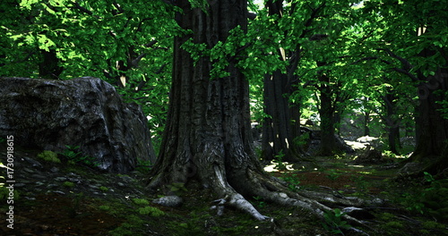 Naklejka premium A serene forest features tall trees with expansive, green leaves. Sunlight filters through the canopy, revealing a rich ecosystem with rocks and undergrowth.