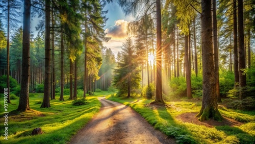 Obraz premium A serene forest landscape featuring a winding dirt path diverging into two...