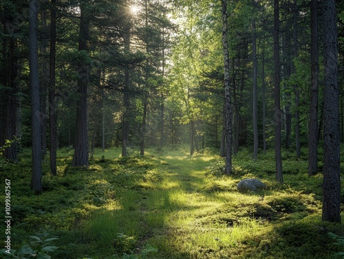 Obraz premium A serene forest landscape featuring sunlight filtering through tall trees,...