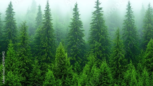 © Thamonchanok, Obraz premium A serene forest landscape shrouded in mist, showcasing lush green pine trees.