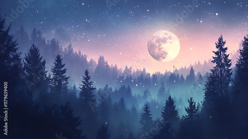 Naklejka premium A serene forest landscape under a full moon with a starry sky and misty...