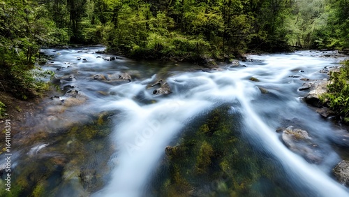 © Koto, Obraz premium A serene forest landscape with a small cascade of water flowing over moss-covered rocks and stones