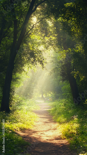 Fototapeta premium A serene forest path bathed in dappled sunlight filtering through the dense...