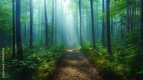 Naklejka premium A serene forest path bathed in soft sunlight filtering through tall trees,...
