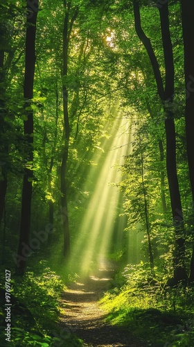 Obraz premium A serene forest path bathed in sunlight, showcasing the beauty of nature and tranquility within lush green surroundings.