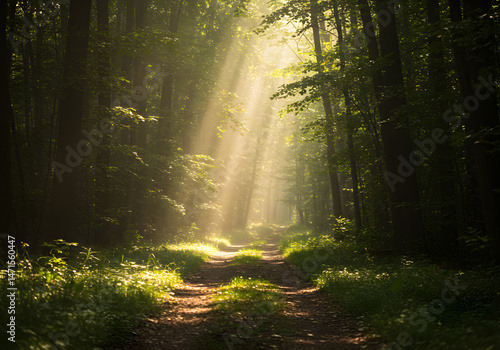 Fototapeta premium A serene forest path bathed in sunlight, with rays piercing through the dense trees, creating a tranquil and magical atmosphere.