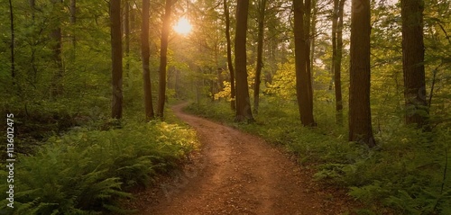 Fototapeta premium A serene forest path, bathed in the soft glow of the setting sun