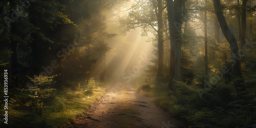 Naklejka premium A serene forest path illuminated by golden sunlight filtering through the trees and mist